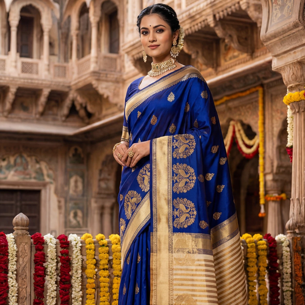 Semi raw silk saree navy blue with allover mirror work and lace work border