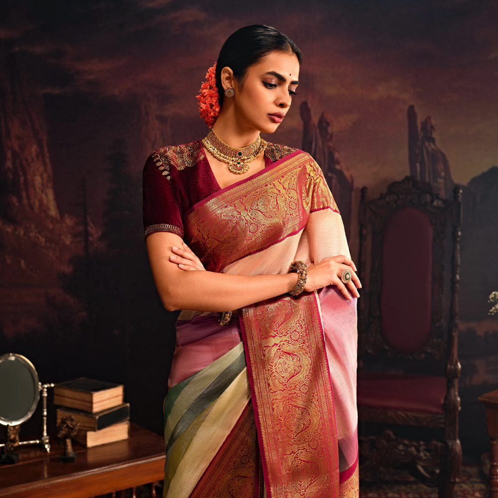 Semi raw silk saree beige with embroidery buttas and floral embroidery border