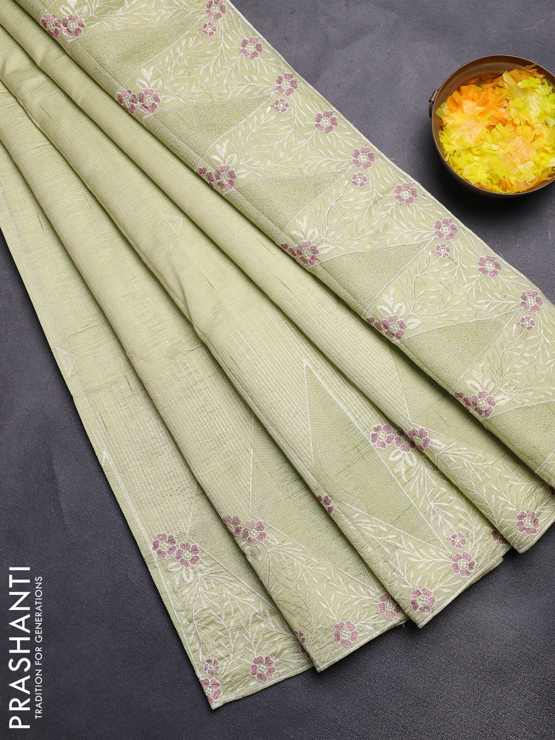 Semi raw silk saree pista green with embroidery buttas and long embroidery border