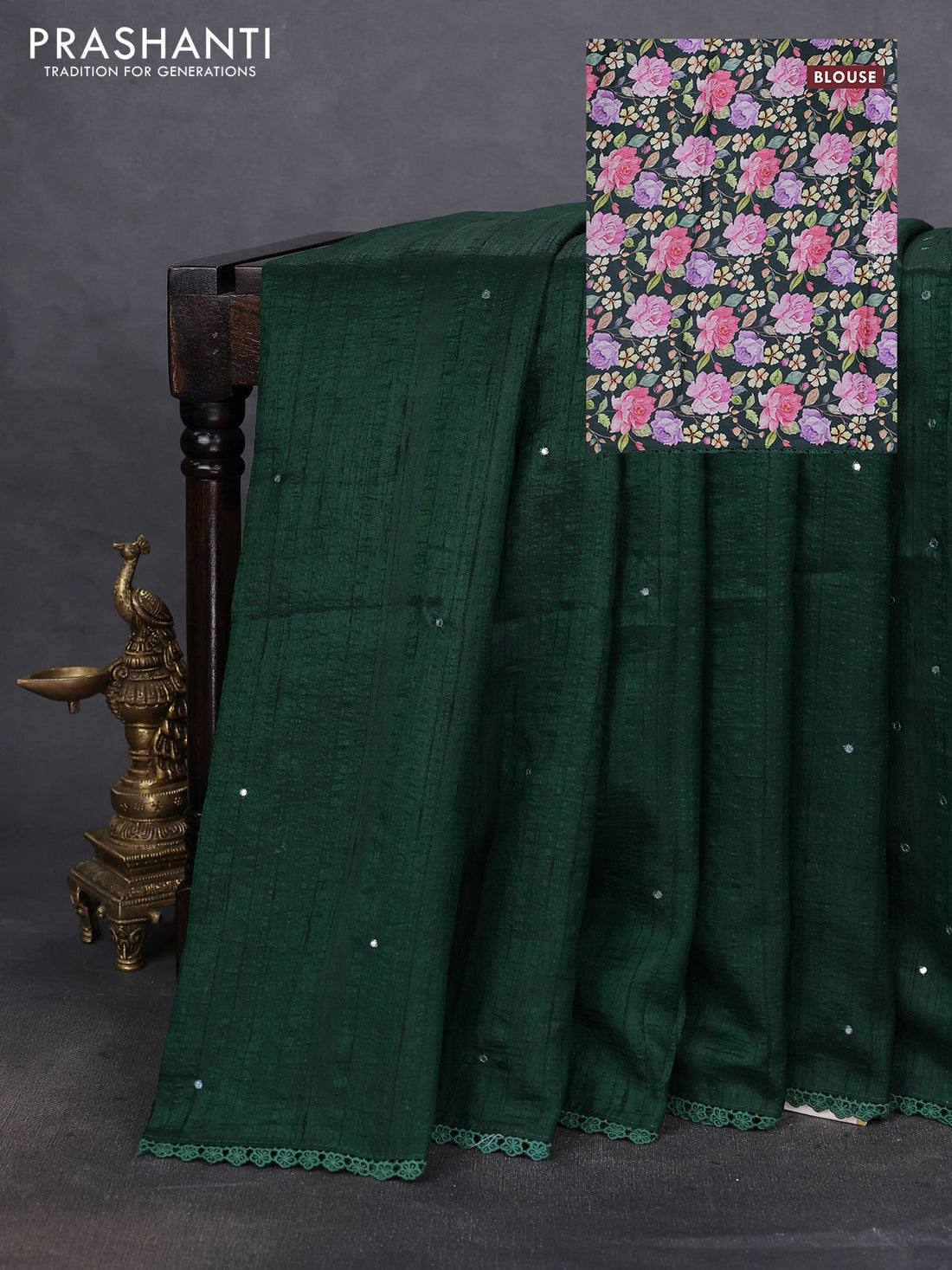 Semi raw silk saree green with embroidery buttas and floral embroidery border