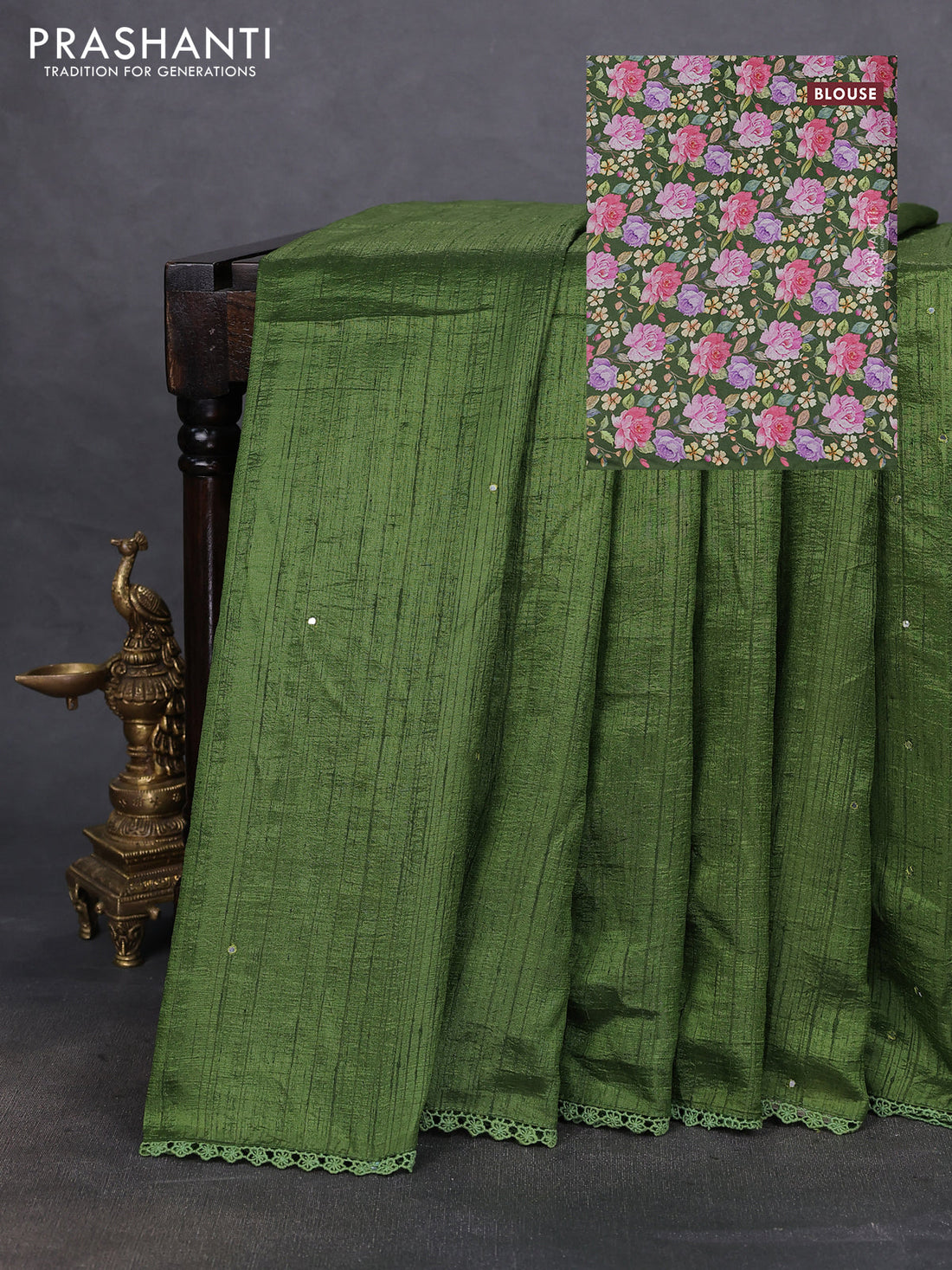 Semi raw silk saree green with allover mirror work and lace work border